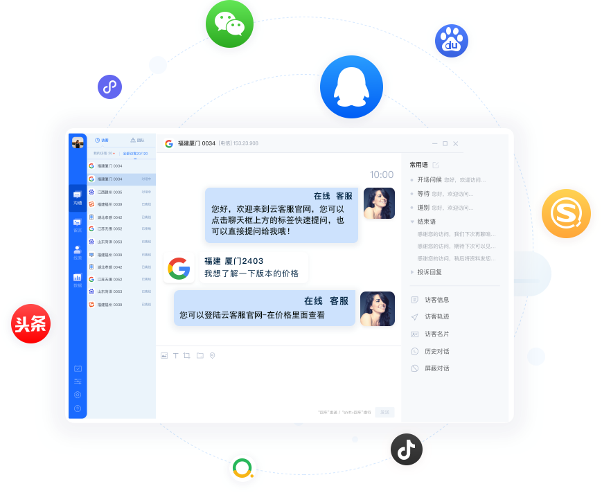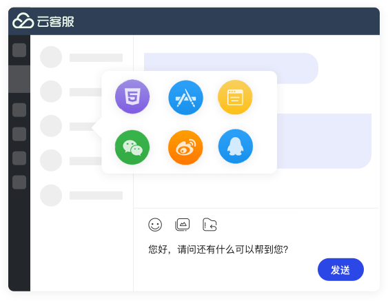 支持网站,QQ,微信,小程序,微博,短信,邮件,公众号,APP等多渠道接入