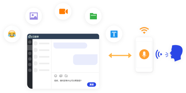 支持语音输入+语音回复的全语音交互支持文字、视频、图片、表情、文件等多种沟通方式