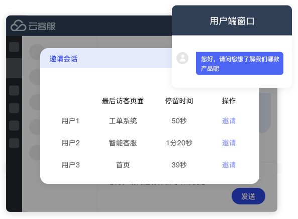 自主配置发起规则,系统智能判断,满足条件时主动发起会话,抓住每一个潜在客户 客服实时查看当前在线用户情况,主动出击,发起会话